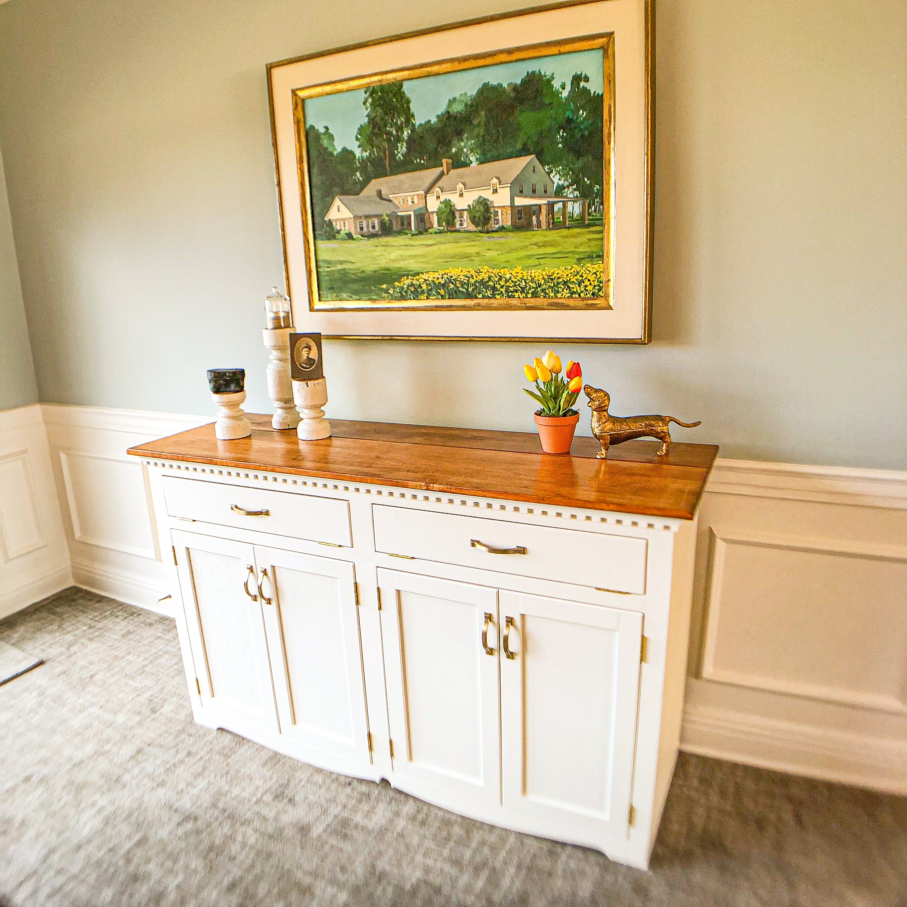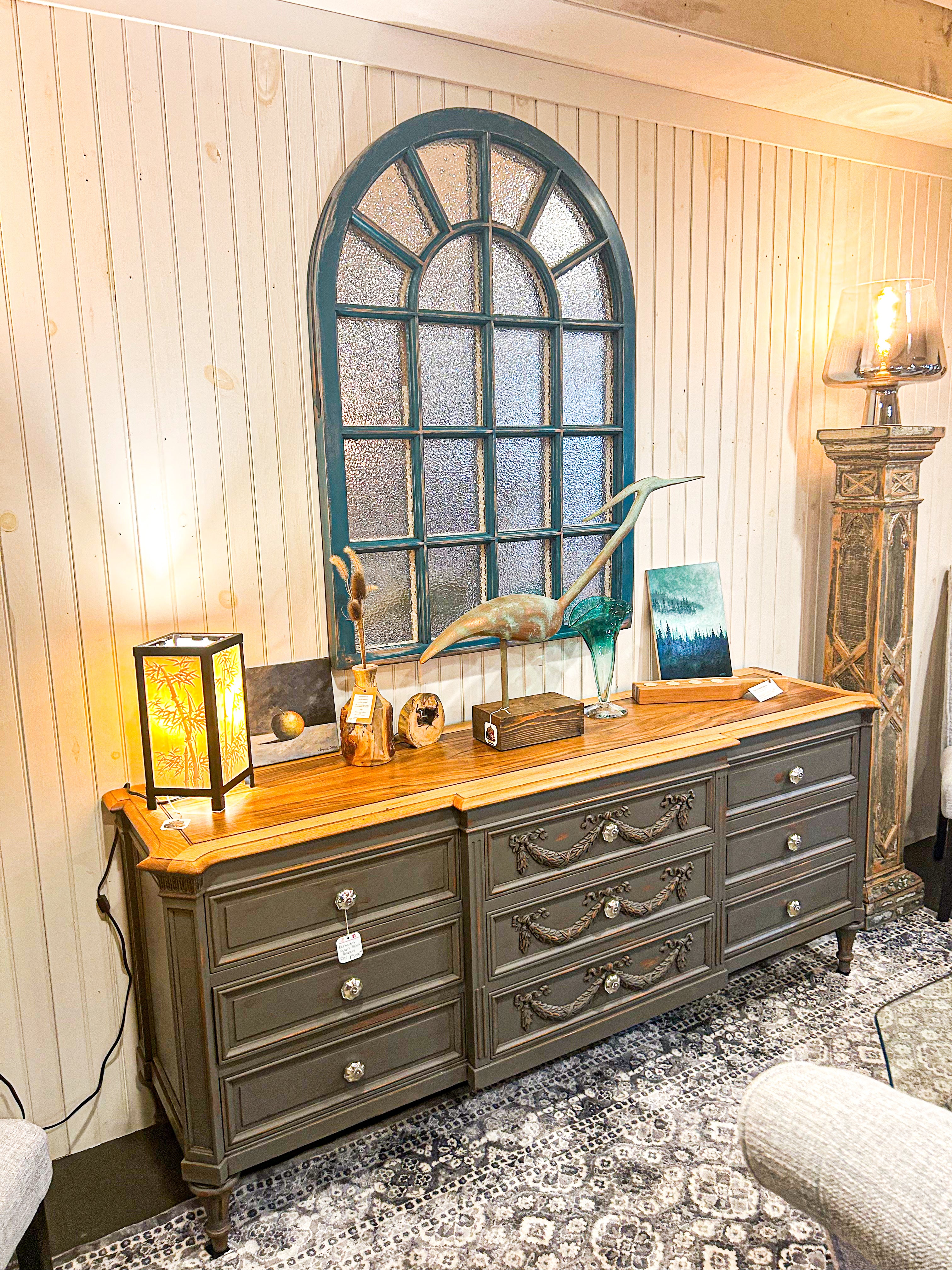 Refinished chest of drawers from Karge's furniture. We updated this piece by going with an antiqued gray finish and added a bleached top with vintage style mercury glass knobs.