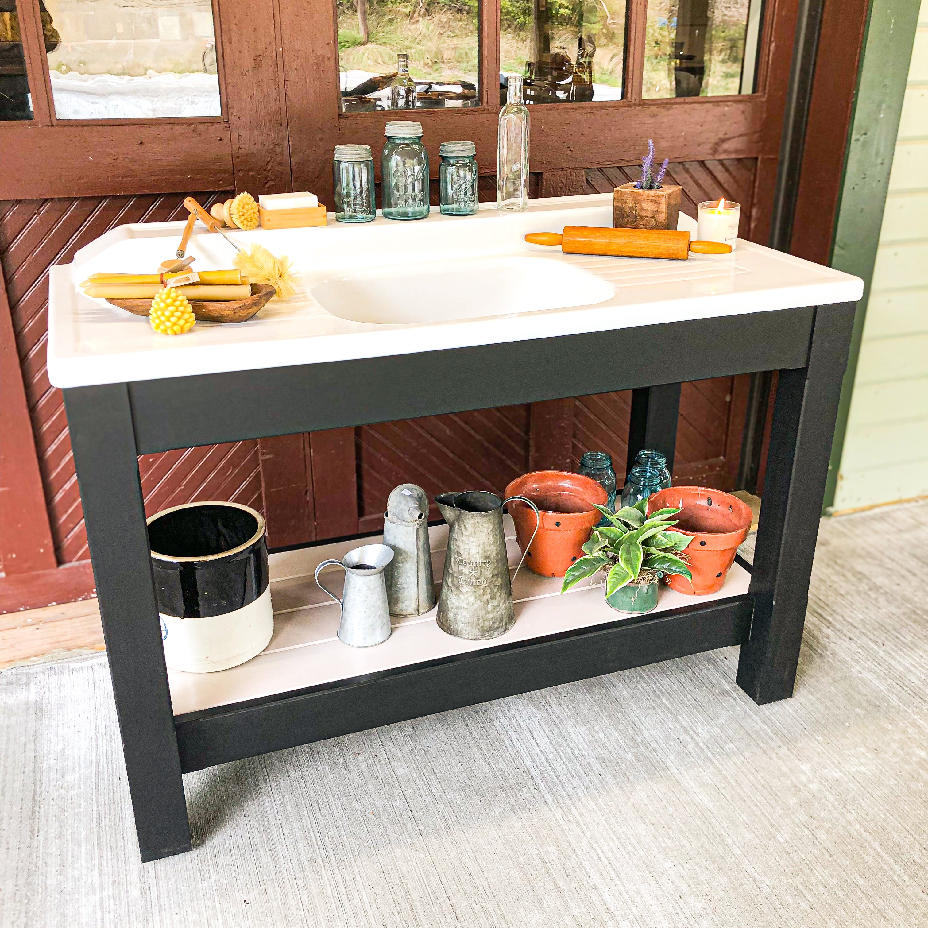 Repurposed enamelled sink top that is now functioning with a custom built base as a plant and potting stand.