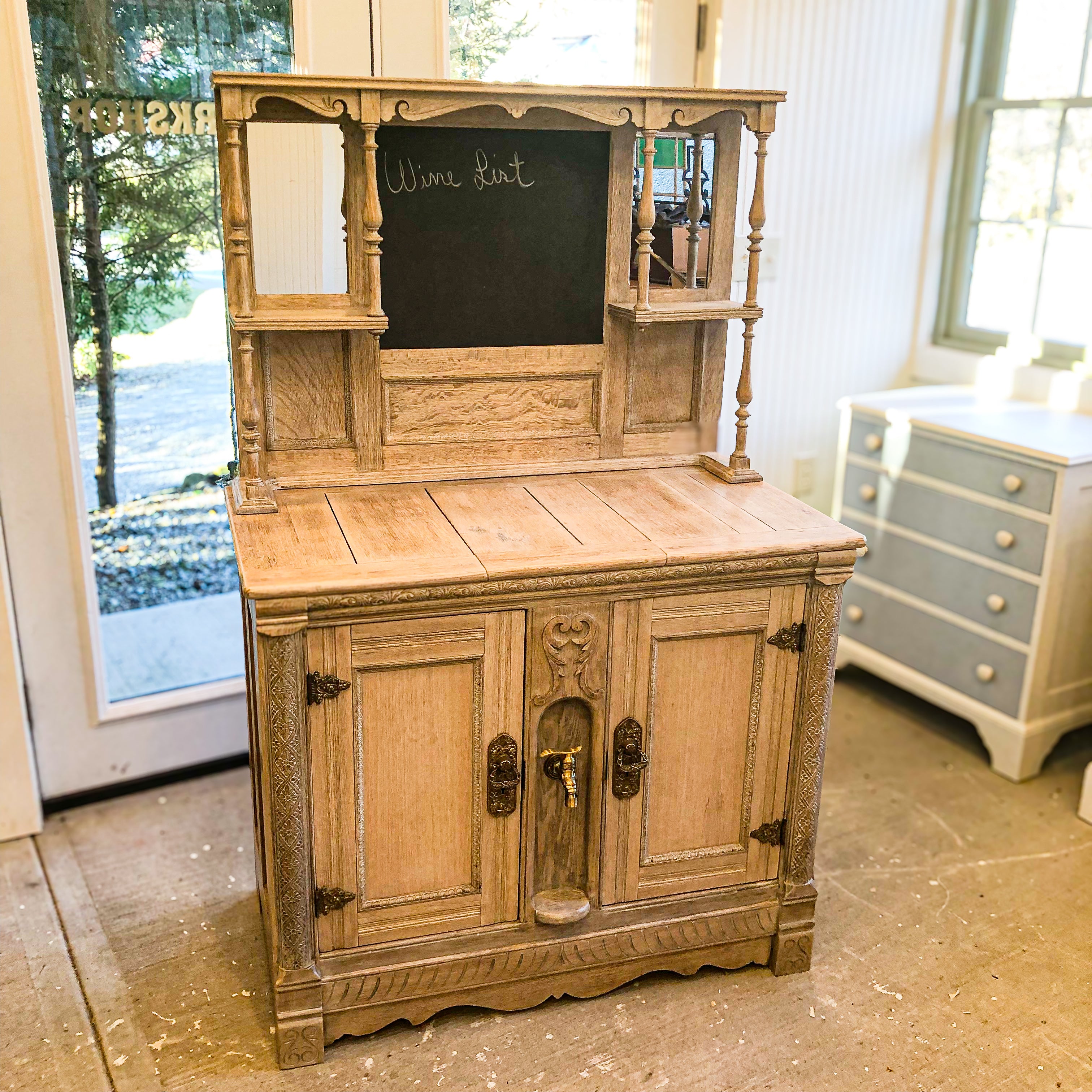 This was a repurposed ice box that we also completely refinished. We added a new stainless steel bin, new plumbing, and stripped and bleached it with a lime wash finish.