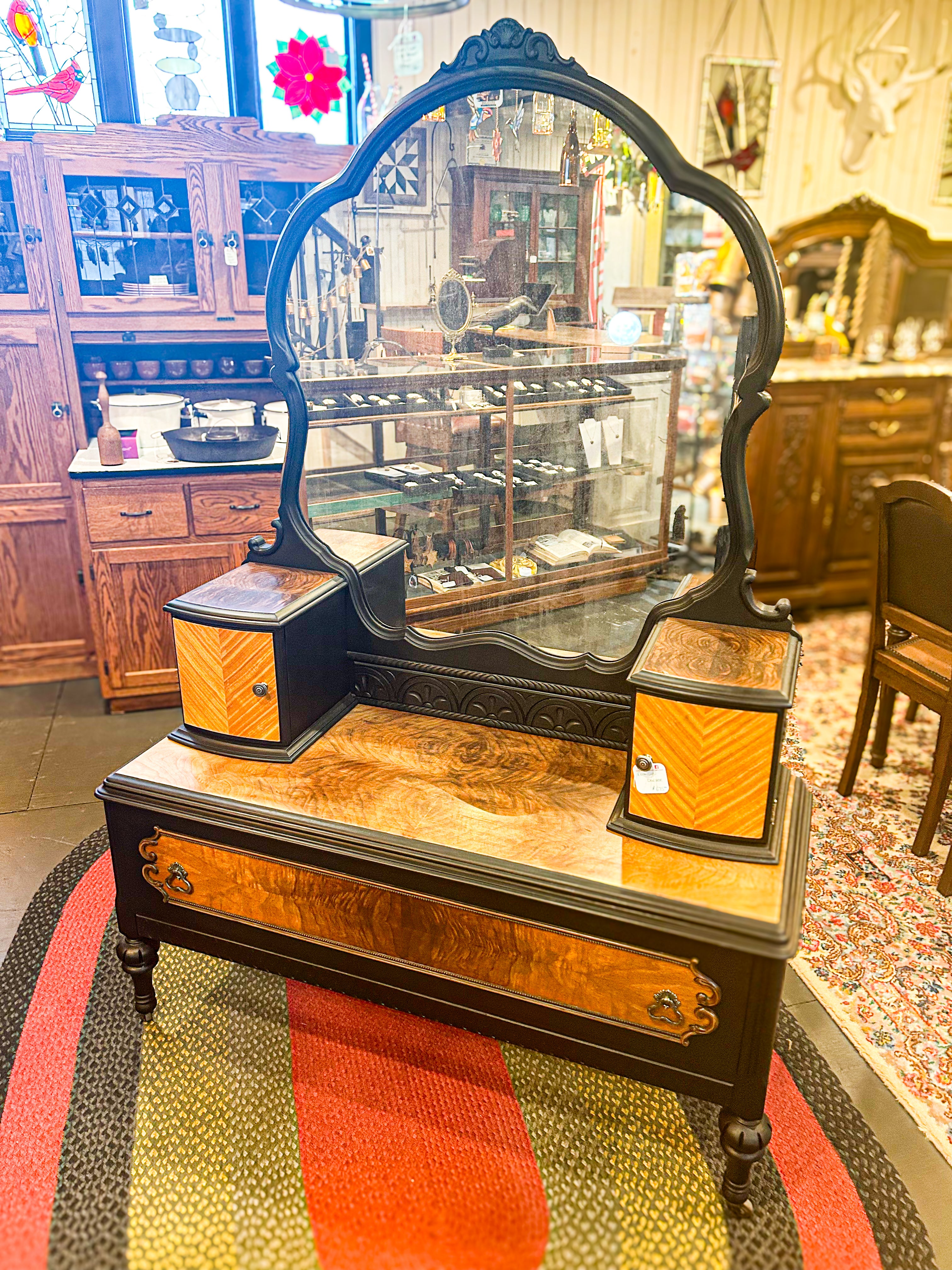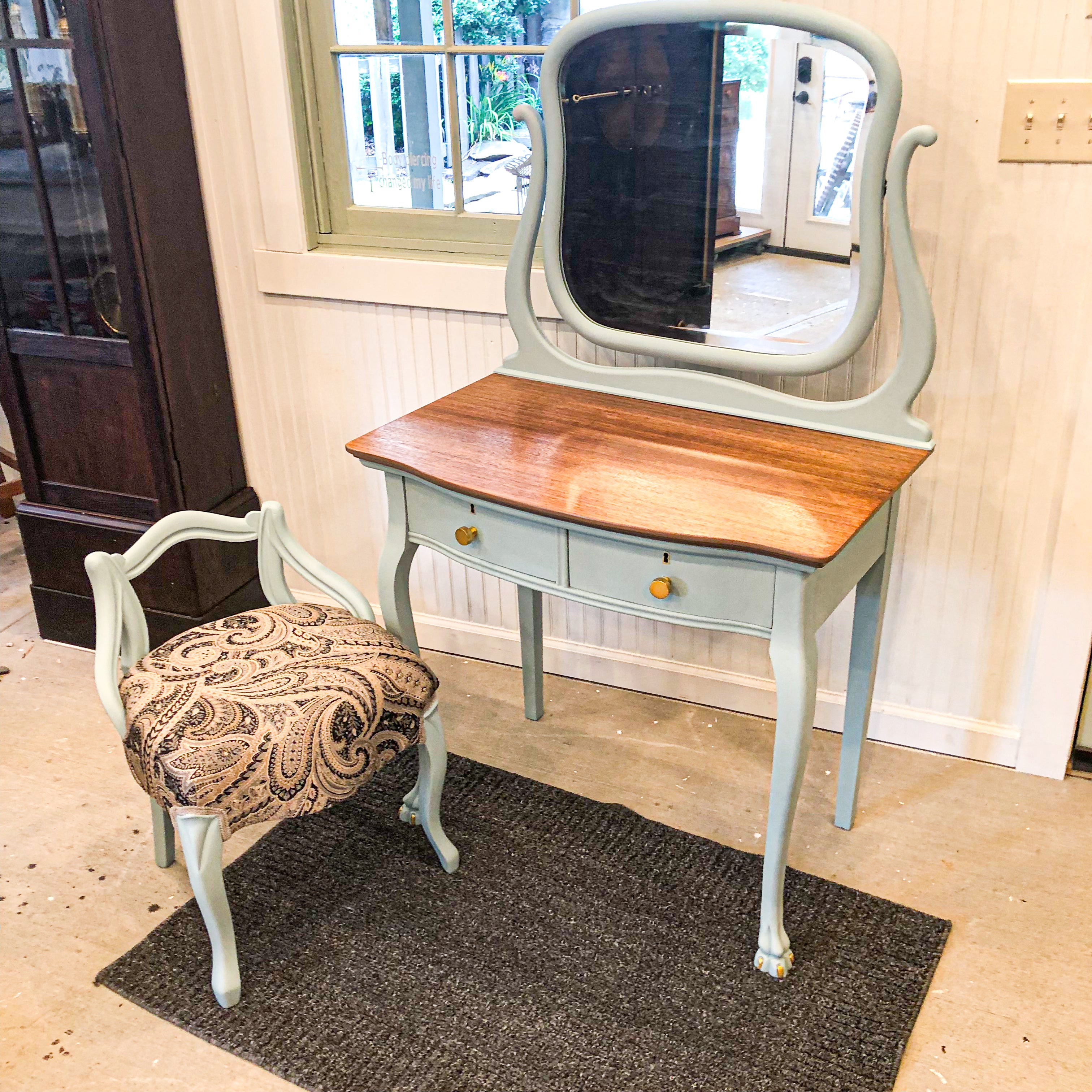 Refinished vanity and upholstered chair set. This set was originally painted a dark brown and black and we refinished it to give a bright, clean finish.