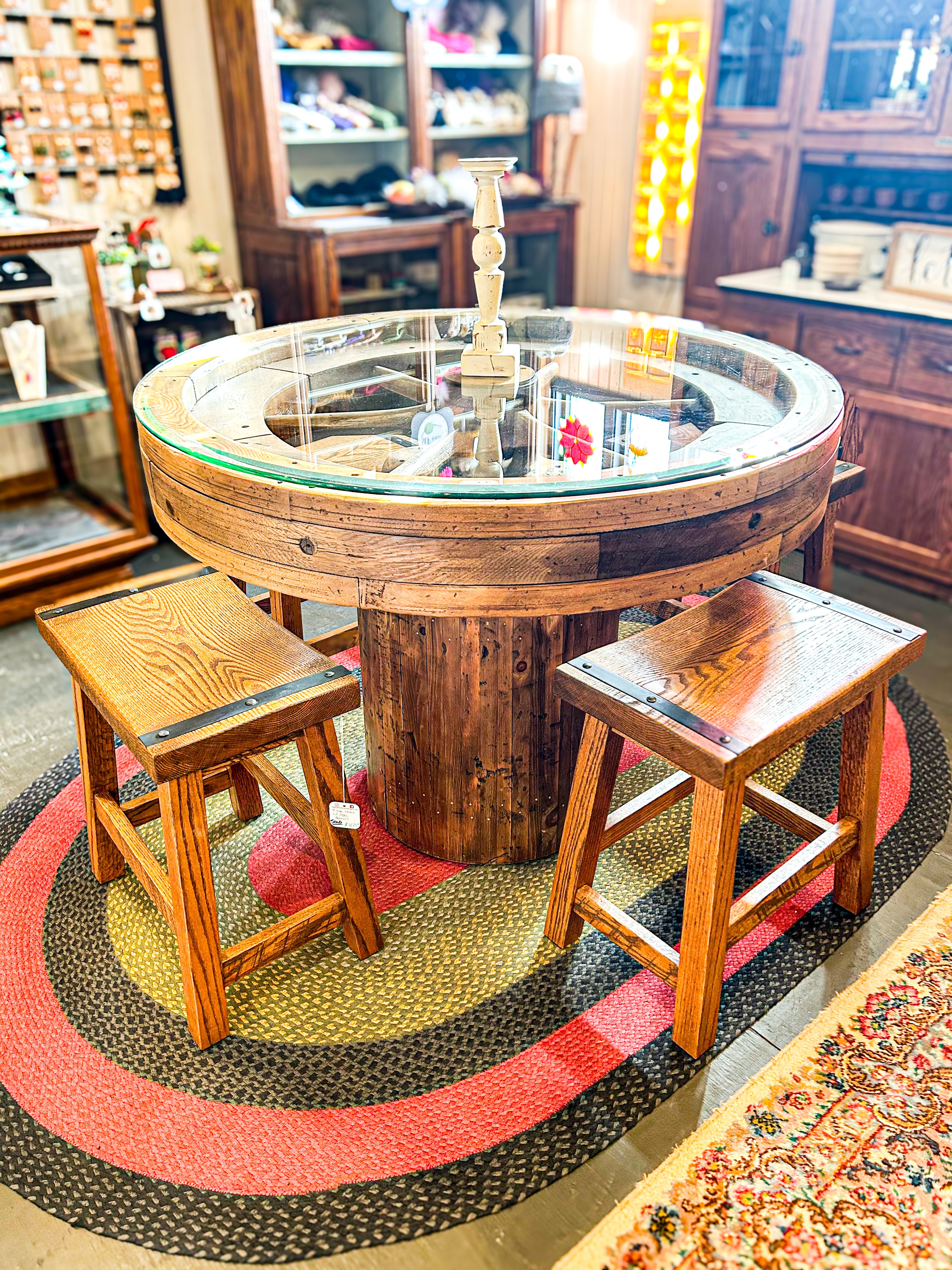 Repurposed table set. The base is made with wood concrete mold used to make street light foundations for the interstate systems in the late 1940s. The wheel used for the top is a belt wheel from the Sarah Furnace Grist Mill in Blair county. The stools are hand built by us.