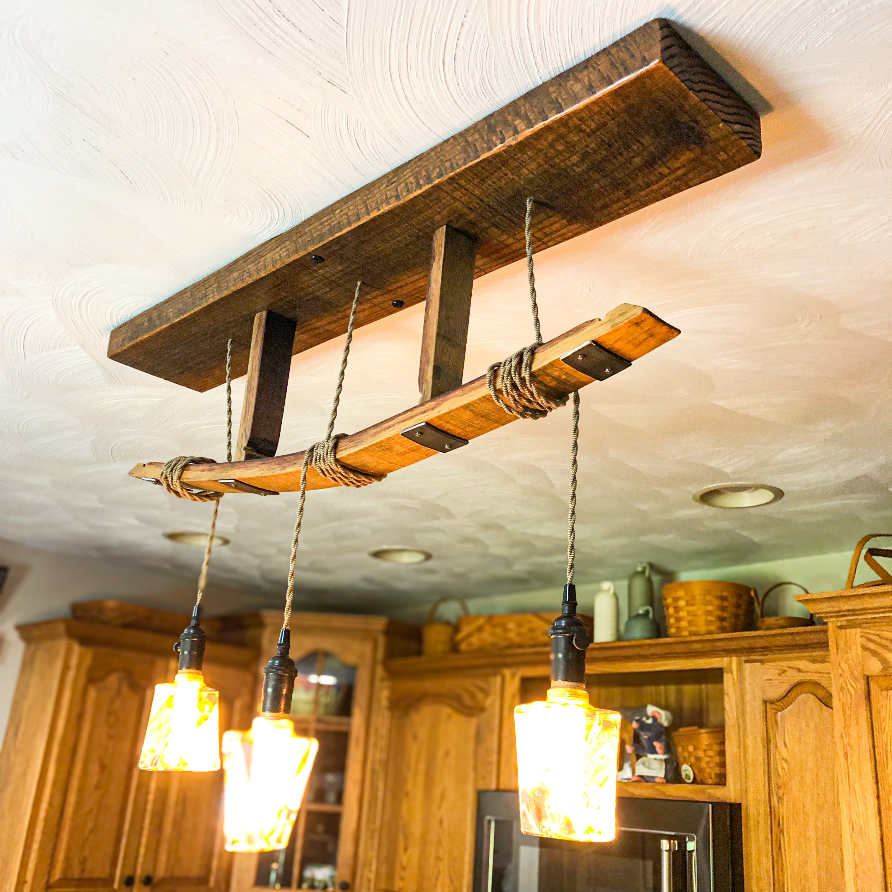 Handcrafted rustic pendant light, made with a red oak base and adjustable lights that hang from a wine barrel stave