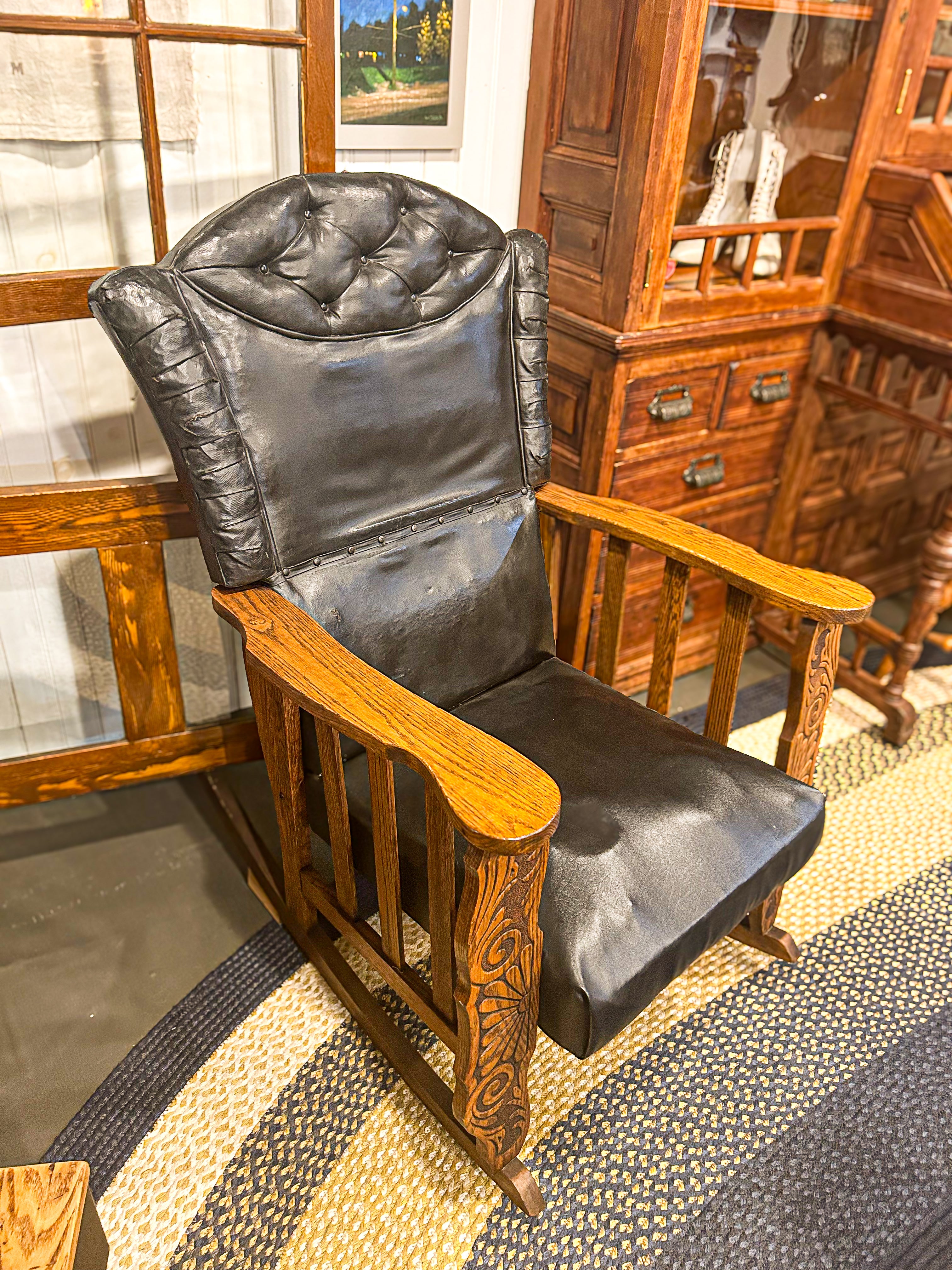 Refinished leather rocking chair with beautifully detailed carvings on the wood.