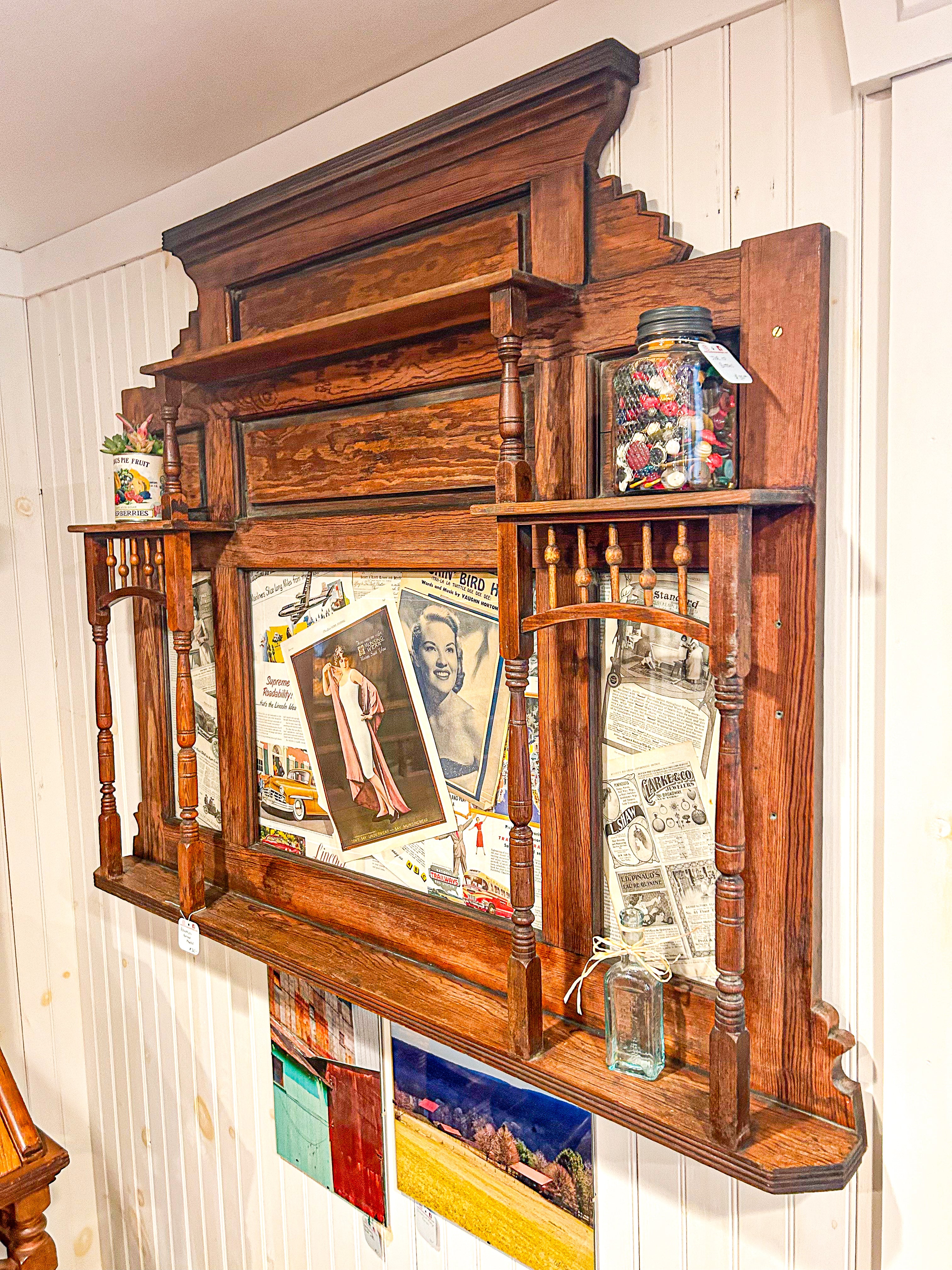 Repurposed antique mantel, featuring original, historical newspaper clippings and pictures.