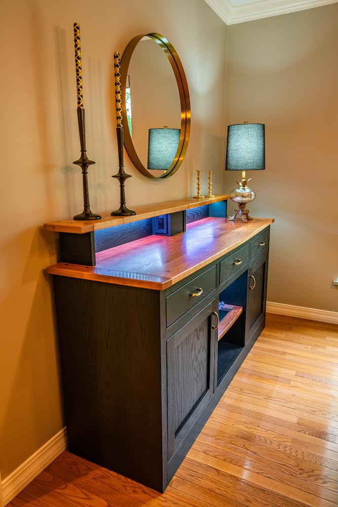 Custom sideboard featuring a cherry top with breadboard and a black finished oak base. It includes LED lighting.