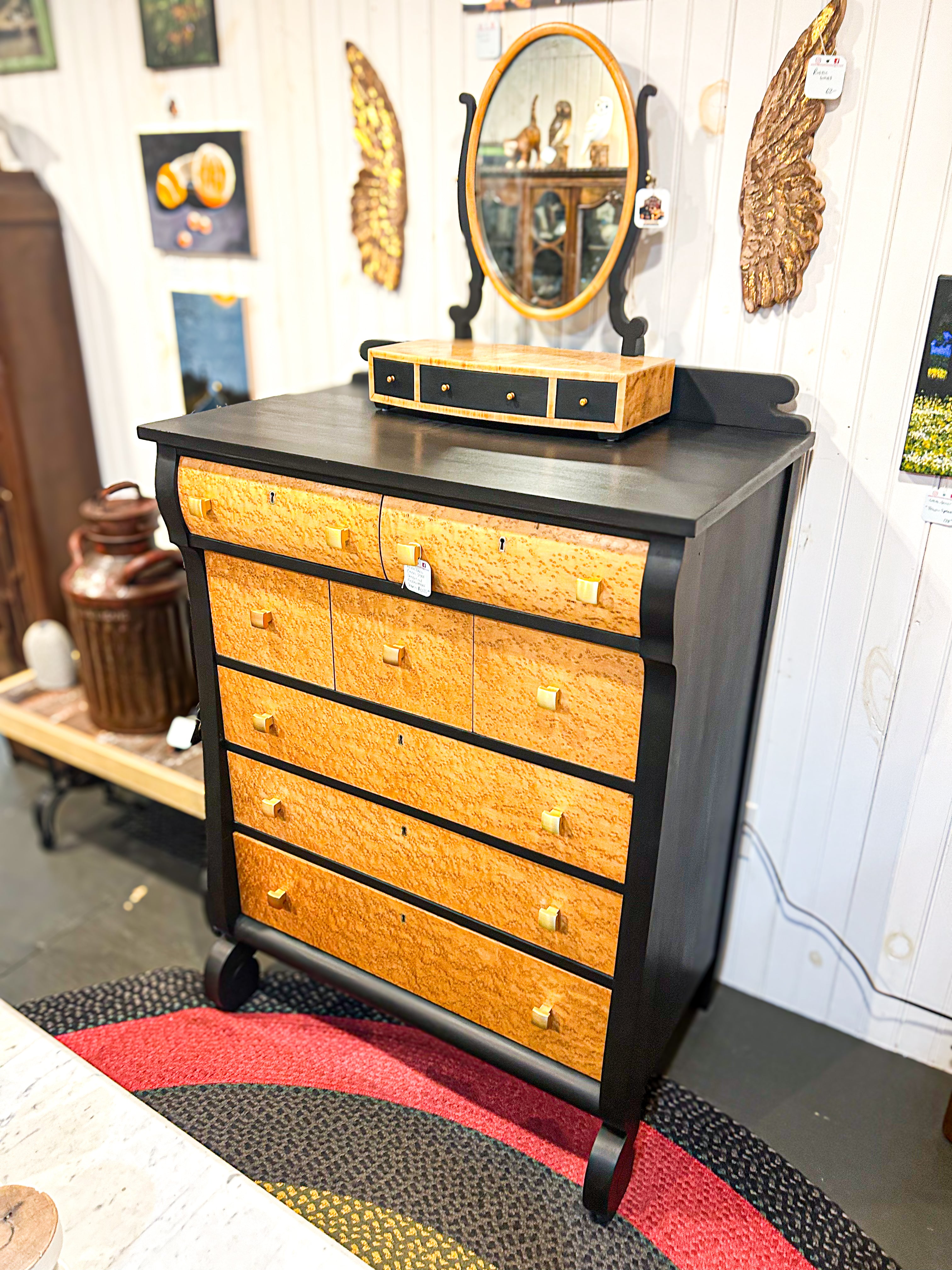 Refinished dresser that was stripped to reveal the grain. We sanded, cleaned and painted it with "Black Noir" by Farmhouse Paints.
